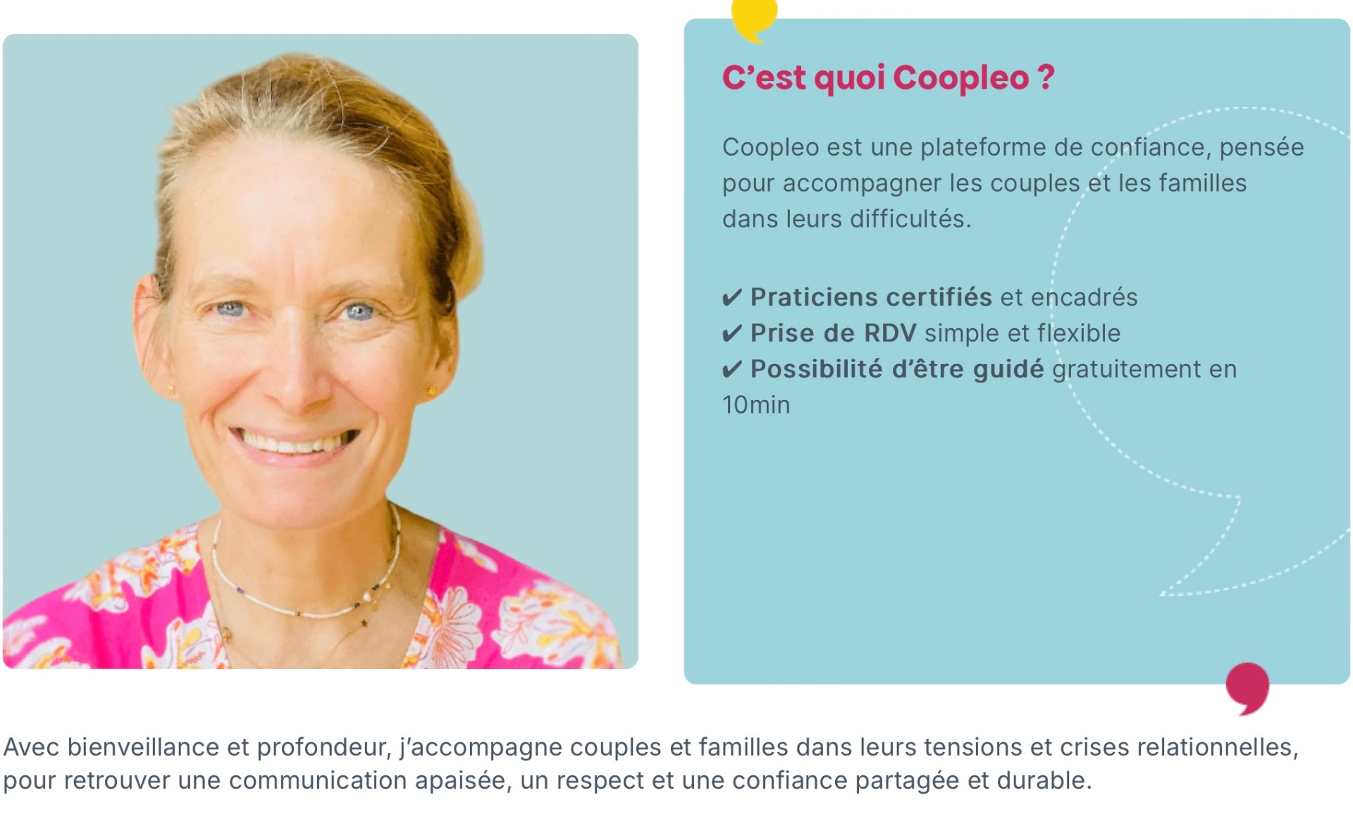 Pour en savoir plus, découvrez mon profil certifié sur Coopleo.care, la plateforme professionnelle dédiée à l'accompagnement des couples et des familles à Nice et dans les Alpes-Maritimes